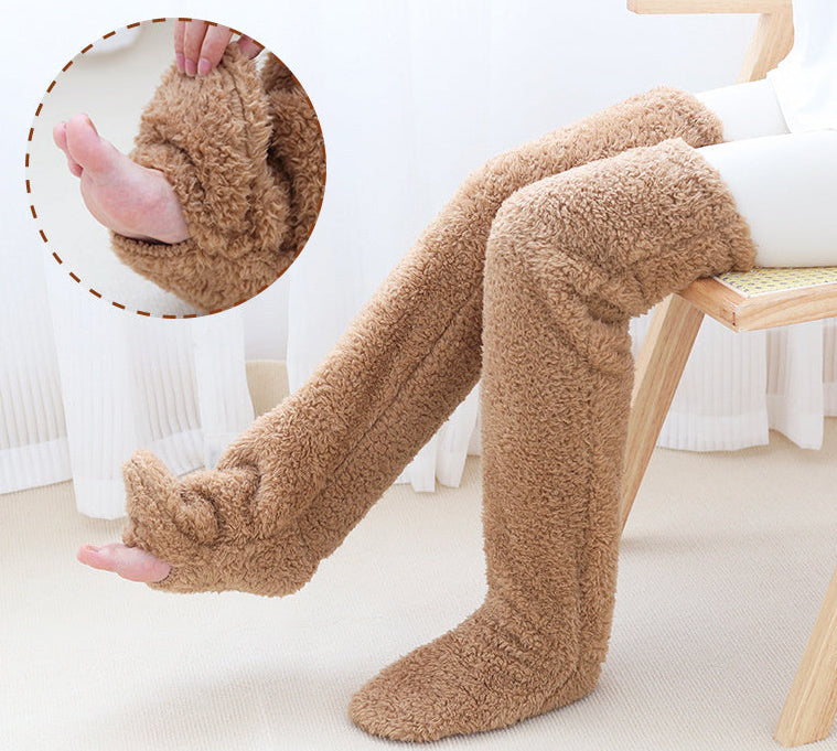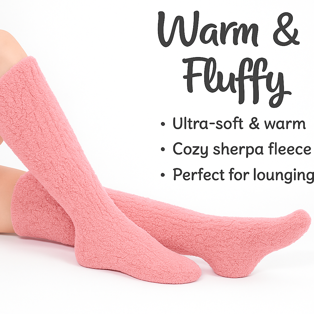1️⃣ Slip On: Gently pull your fuzzy socks up over your knees — the soft sherpa fabric instantly hugs your legs in warmth.